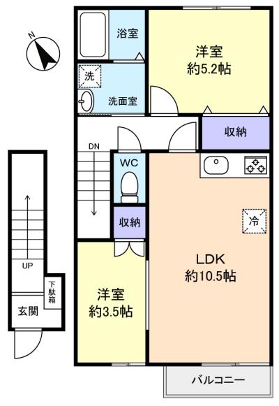 - 洋室(5.2畳),洋室(3.5畳),LDK(10.5畳)