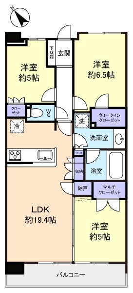 - LDK(19.4畳),洋室(6.5畳),洋室(5畳),洋室(5畳)
