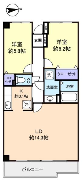 - 洋室(5.8畳),洋室(6.2畳),LDK(17.4畳)