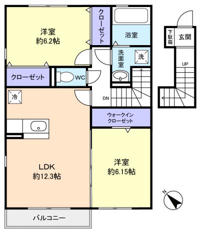 - 洋室(6.1畳),洋室(6.2畳),LDK(12.3畳)