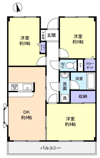 - 洋室(6畳),洋室(5畳),洋室(5畳),DK(9畳)