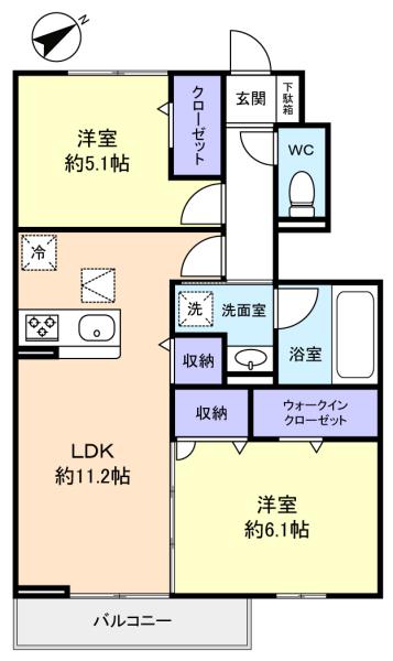 - 洋室(6.1畳),洋室(5.1畳),LDK(11.2畳)