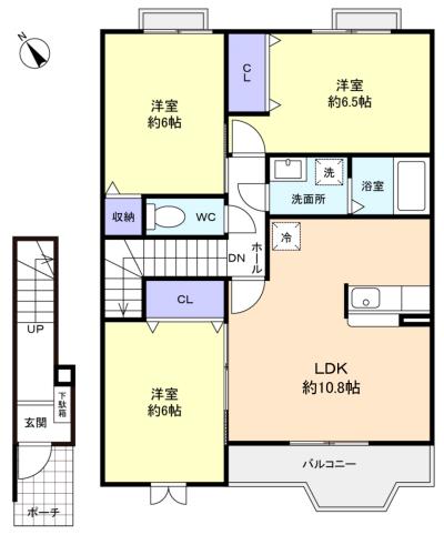 - 洋室(6畳),洋室(6畳),洋室(6.5畳),LDK(10.8畳)