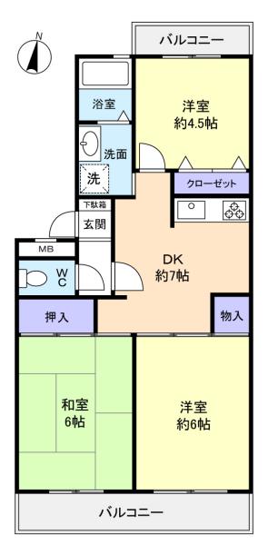 - 和室(6畳),洋室(6畳),洋室(4.5畳),DK(7畳)