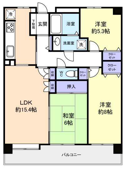 - LDK(15.4畳),洋室(5.3畳),洋室(8畳),和室(6畳)