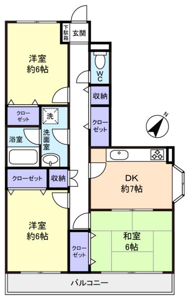 - 洋室(6畳),洋室(6畳),和室(6畳),DK(7畳)