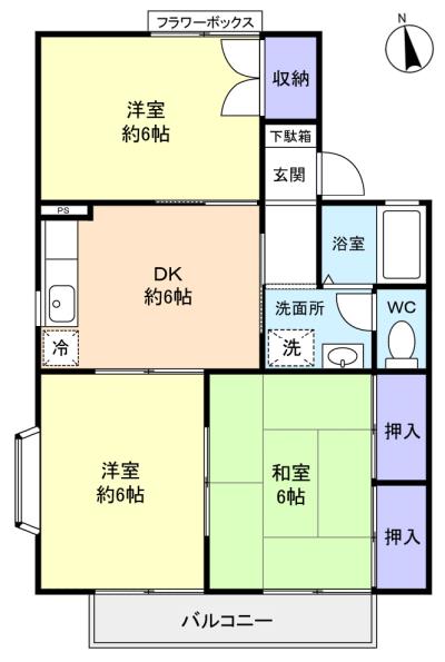 - 和室(6畳),洋室(6畳),洋室(6畳),DK(6畳)