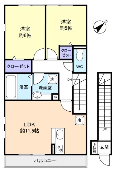 - 洋室(6畳),洋室(5畳),LDK(11.5畳)