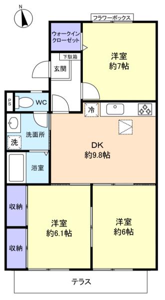 - LDK(9.8畳),洋室(6.9畳),洋室(6.1畳),洋室(5.9畳)
