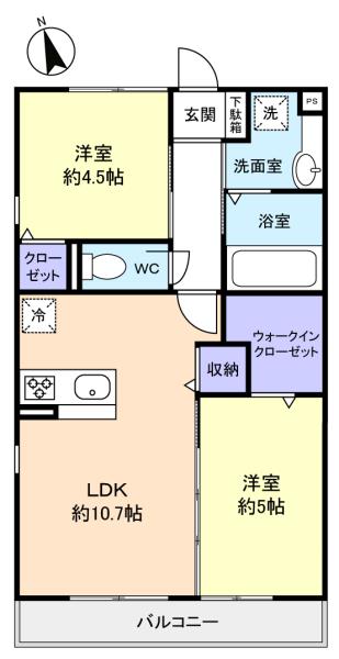 - 洋室(4.5畳),洋室(5畳),LDK(10.7畳)