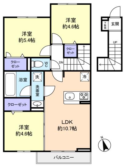 - LDK(10.7畳),洋室(5.4畳),洋室(4.6畳),洋室(4.6畳)