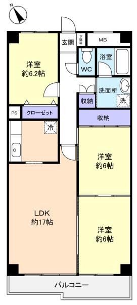 洋室(6畳),洋室(6.2畳),LDK(17畳),洋室(6畳)