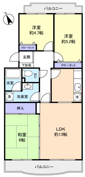- 洋室(5.2畳),洋室(4.7畳),和室(6畳),LDK(13畳)