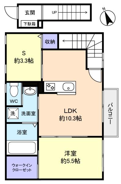 - 洋室(5.5畳),納戸(3.3畳),LDK(10.3畳)