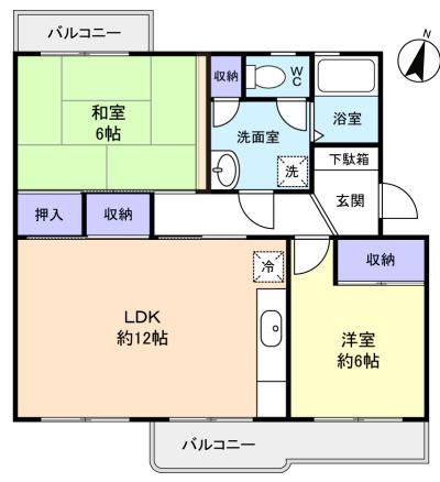 - 和室(6畳),洋室(6畳),LDK(12畳)