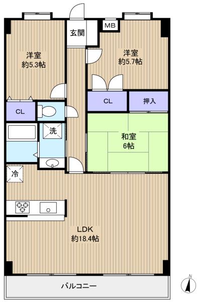 - LDK(18.4畳),和室(6畳),洋室(5.3畳),洋室(5.7畳)