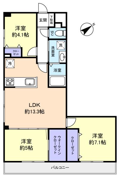 - LDK(13.3畳),洋室(7.1畳),洋室(5畳),洋室(4.1畳)