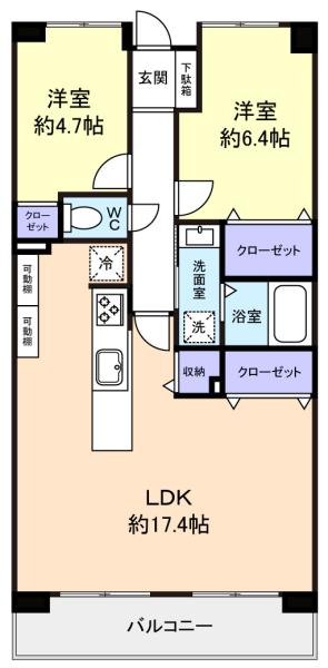 - LDK(17.4畳),洋室(6.4畳),洋室(4.7畳)