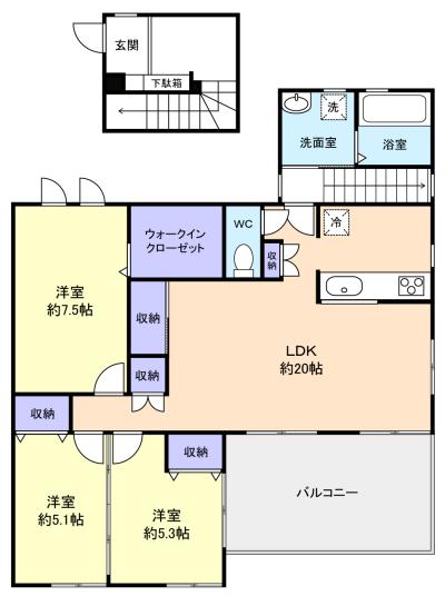 - LDK(20畳),洋室(5.1畳),洋室(5.3畳),洋室(7.5畳)