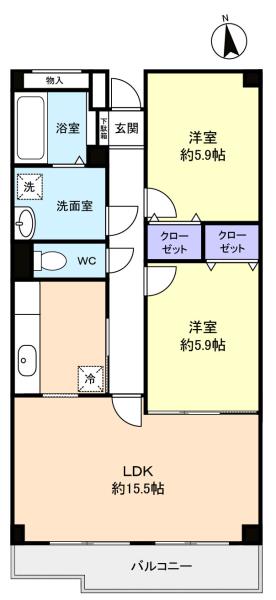 - 洋室(5.9畳),洋室(5.9畳),LDK(15.5畳)