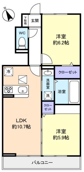 - LDK(10.7畳),洋室(5.8畳),洋室(6.1畳)