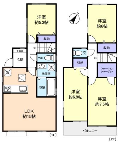 - LDK(15畳),洋室(5.3畳),洋室(7.5畳),洋室(6.9畳),洋室