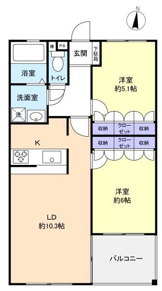 - LD(10.3畳),K(2畳),洋室(5.1畳),洋室(6畳)