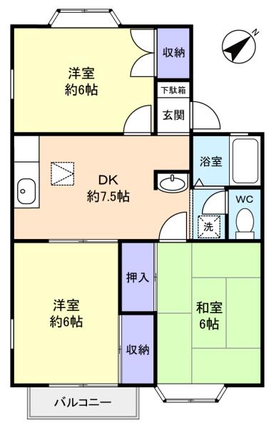 洋室(6畳),和室(6畳),DK(7.5畳),洋室(6畳)