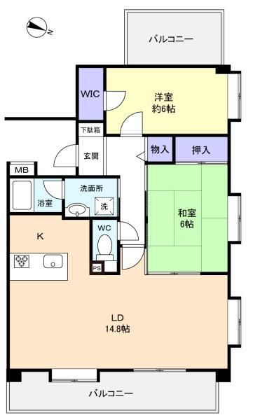- 洋室(6畳),和室(6畳),LDK(14.8畳)