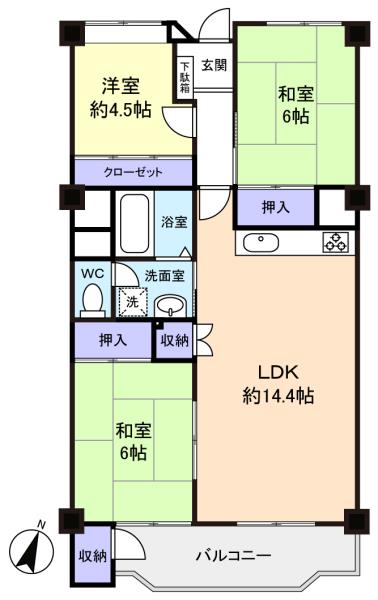 - LDK(14.4畳),洋室(4.5畳),和室(6畳),和室(6畳)