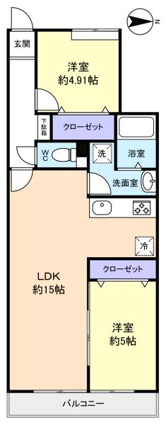 - LDK(15畳),洋室(5畳),洋室(4.9畳)
