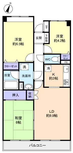 LDK(12.8畳),洋室(4.2畳),洋室(6.5畳),和室(6畳)