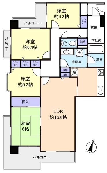 - LDK(15.6畳),和室(6畳),洋室(4.8畳),洋室(5.2畳),洋室