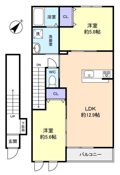 LDK(12.9畳),洋室(5.8畳),洋室(5.6畳)