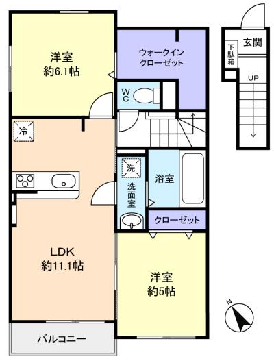 - 洋室(6.1畳),洋室(5畳),LDK(11.1畳)