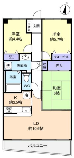 - 洋室(5.7畳),洋室(4.4畳),和室(6畳),LD(10.6畳),K