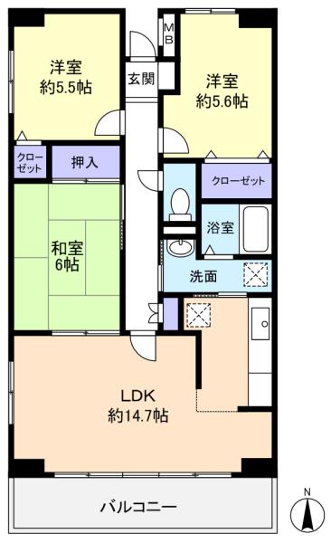 - 洋室(5.5畳),洋室(5.6畳),和室(6畳),LDK(14.7畳)