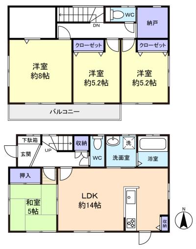 - LDK(14畳),和室(5畳),洋室(8畳),洋室(5.2畳),洋室,納戸(2畳)