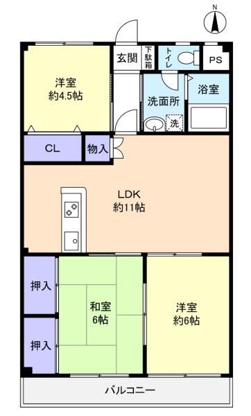 - 洋室(4.5畳),洋室(6畳),和室(6畳),LDK(11畳)